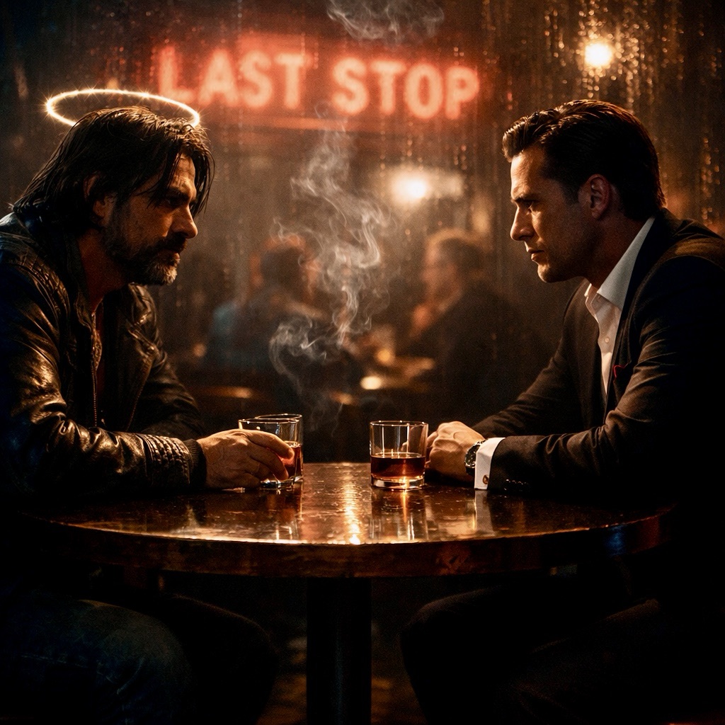 Neon bled across the pavement outside a place called Last Stop, the kind of bar where nobody asks your name, only your sin. The sign flickered like a dying heartbeat, and inside the air tasted like old smoke and decisions that never learned their lesson.