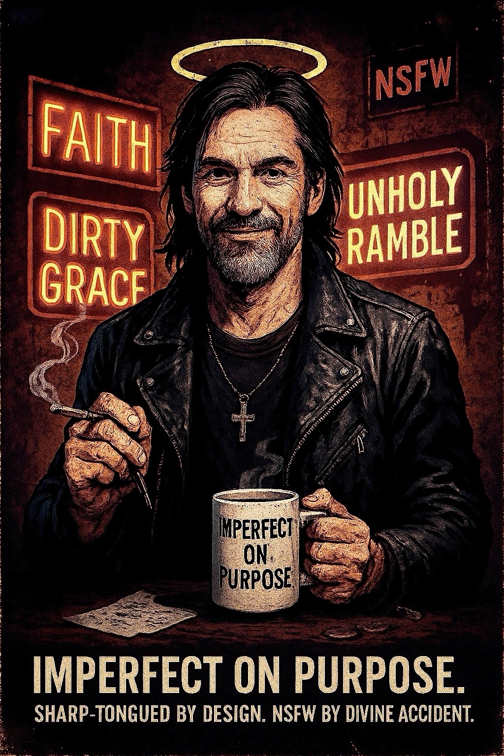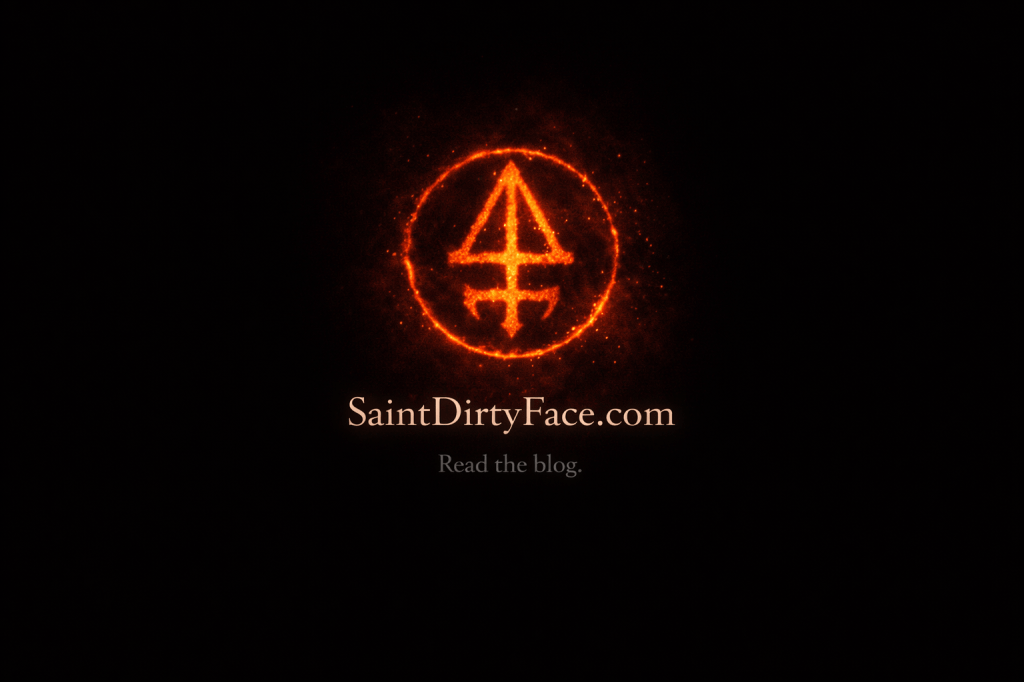 Saint Dirty Face. Imperfect on purpose. Faithful with fangs. Here to spill it all, laugh at the absurd, and maybe light a match under your too-comfortable chair.