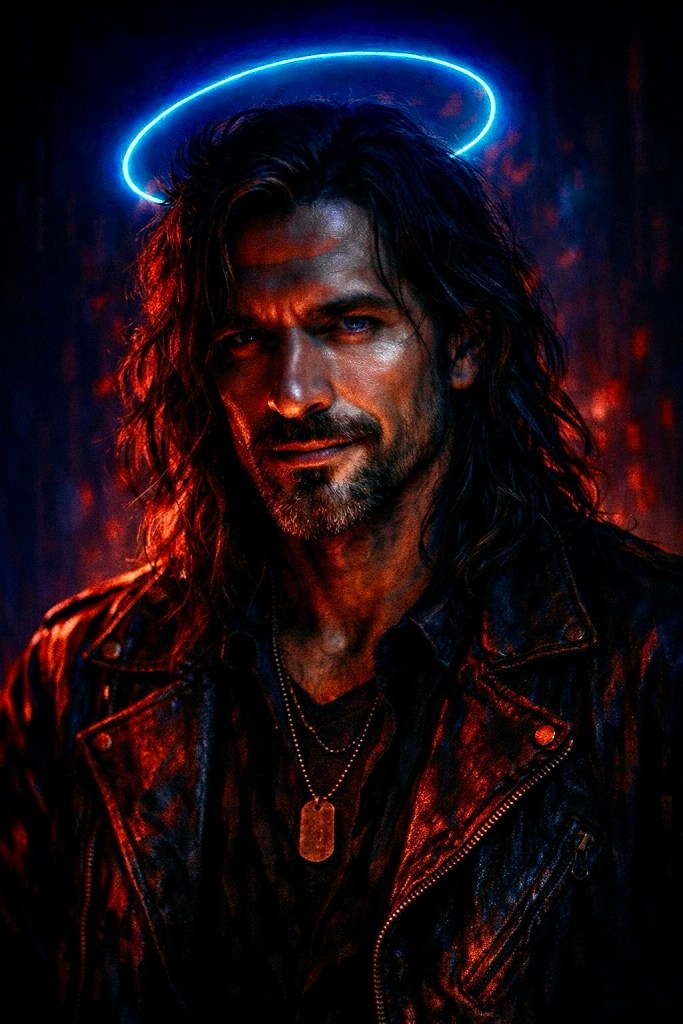 Just the trench coat. The cracked halo. The eyes that know too much.
