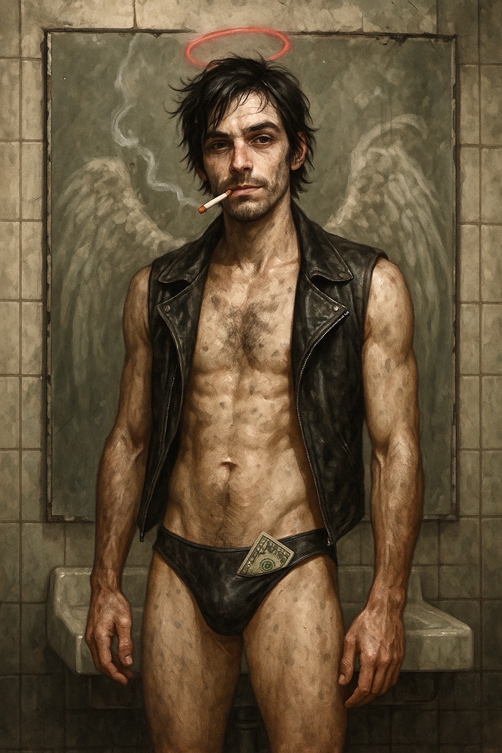 halo crooked, cigarette dangling, hips doing the Lord’s indignant work.