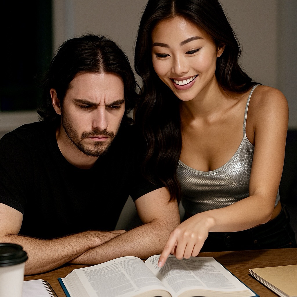 Her shoulder brushes mine. Her foot nudges me under the desk. Not accidents—never accidents. She’s daring me without saying it, pushing the line between sweet study buddy and troublemaker in disguise.