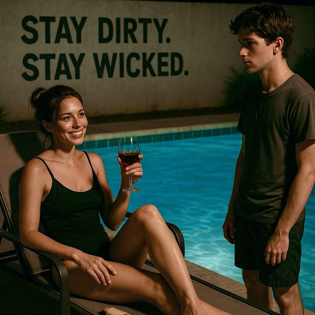 I walked across the warm concrete barefoot, trying not to look at the way her skin caught the moonlight. She passed me a glass, the condensation running down my fingers as if the drink already knew I was sweating.