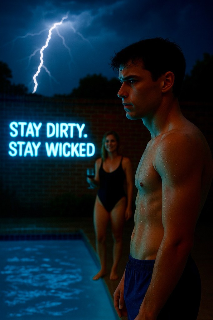 Thunder rolled low, rattling the pool chairs, lightning flashing like the heavens were trying to expose us. The rain came sudden, heavy, the kind of summer storm that makes the air itself feel electric.